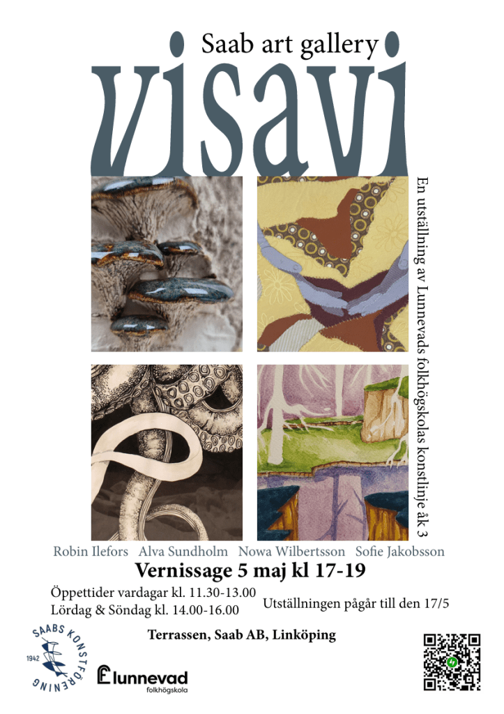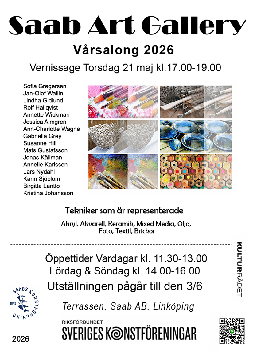 Saabs Konstförening är en ideell förening med ändamål och syfte att väcka, underhålla och bredda intresset för och kunskapen om konst. Föreningen verkar också för att sprida konstbildande och konstförmedlande verksamhet och tillhandahålla konst till överkomliga priser för medlemmarna samtidigt som föreningen erbjuder besökare på utställningar en stunds avkoppling med fina och bra konstupplevelser av god kvalité. I menyn Om oss kan du läsa mer om föreningen, hur du kommer i kontakt med styrelsen för att få information om vår verksamhet eller har andra frågor.
