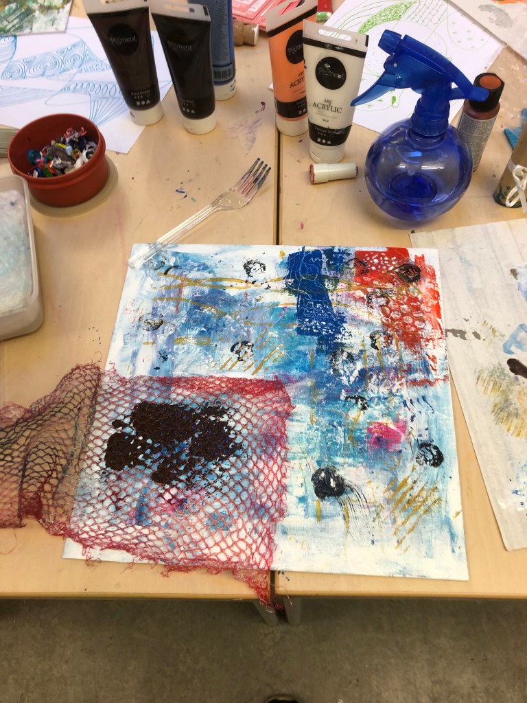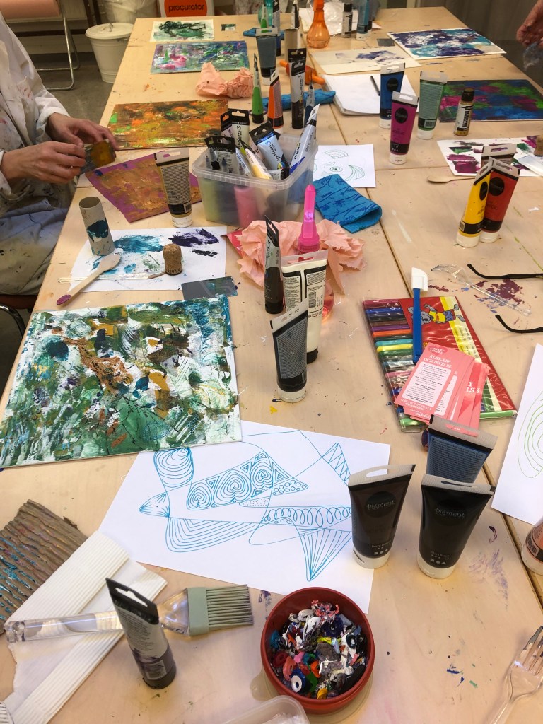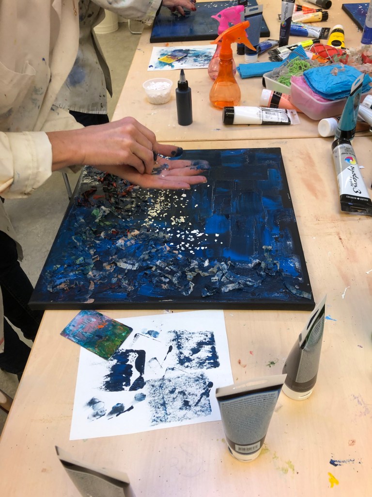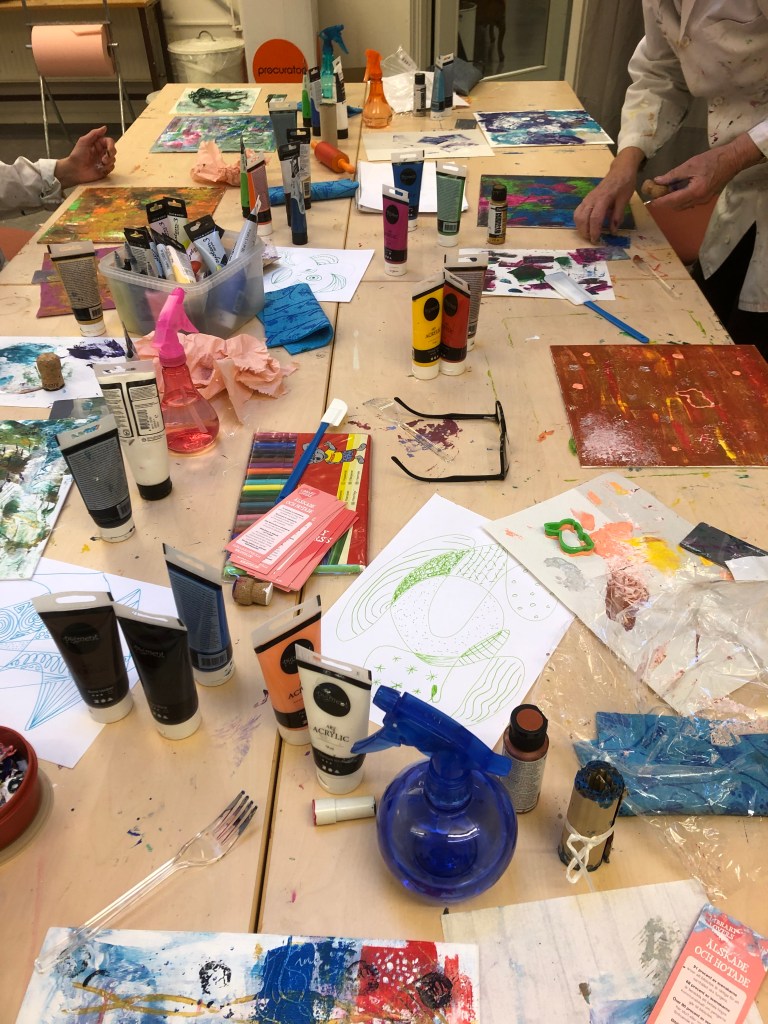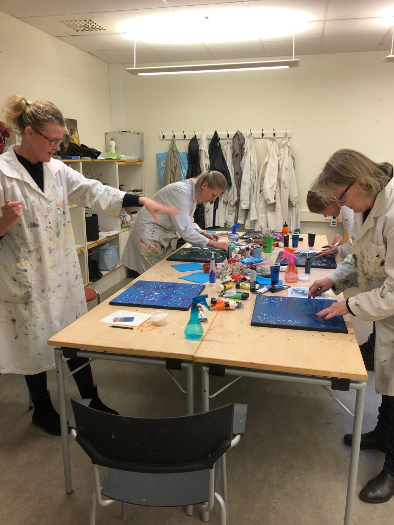 ”De här två lördagarna har verkligen varit något utöver det vanliga och det är så roligt att få experimentera sig fram med färger och detta kreativa sätt att skapa. Dessutom är det väldigt roligt och givande att ses i grupp och skapa, för även om vi använder samma kreativa metoder så gör vi olika och får olika resultat – det är superhäftigt och inspirerande. Äntligen är jag igång och ser redan fram emot nästa lördag.”
