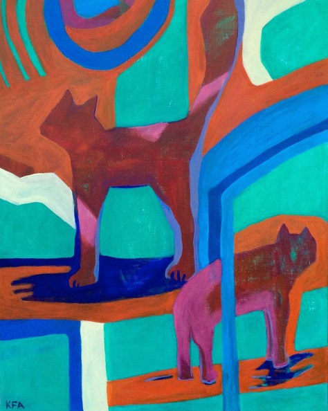 Hon säger: ”Det börjar med möten mellan färg och form som landar på en duk i en salig blandning. Att sedan försöka reda ut allt till en fungerande bild blir en intressant utmaning. När det så småningom börjar framträda en bild är det minst lika spännande att börja klura ut var i hela friden kom den bilden ifrån?”.
